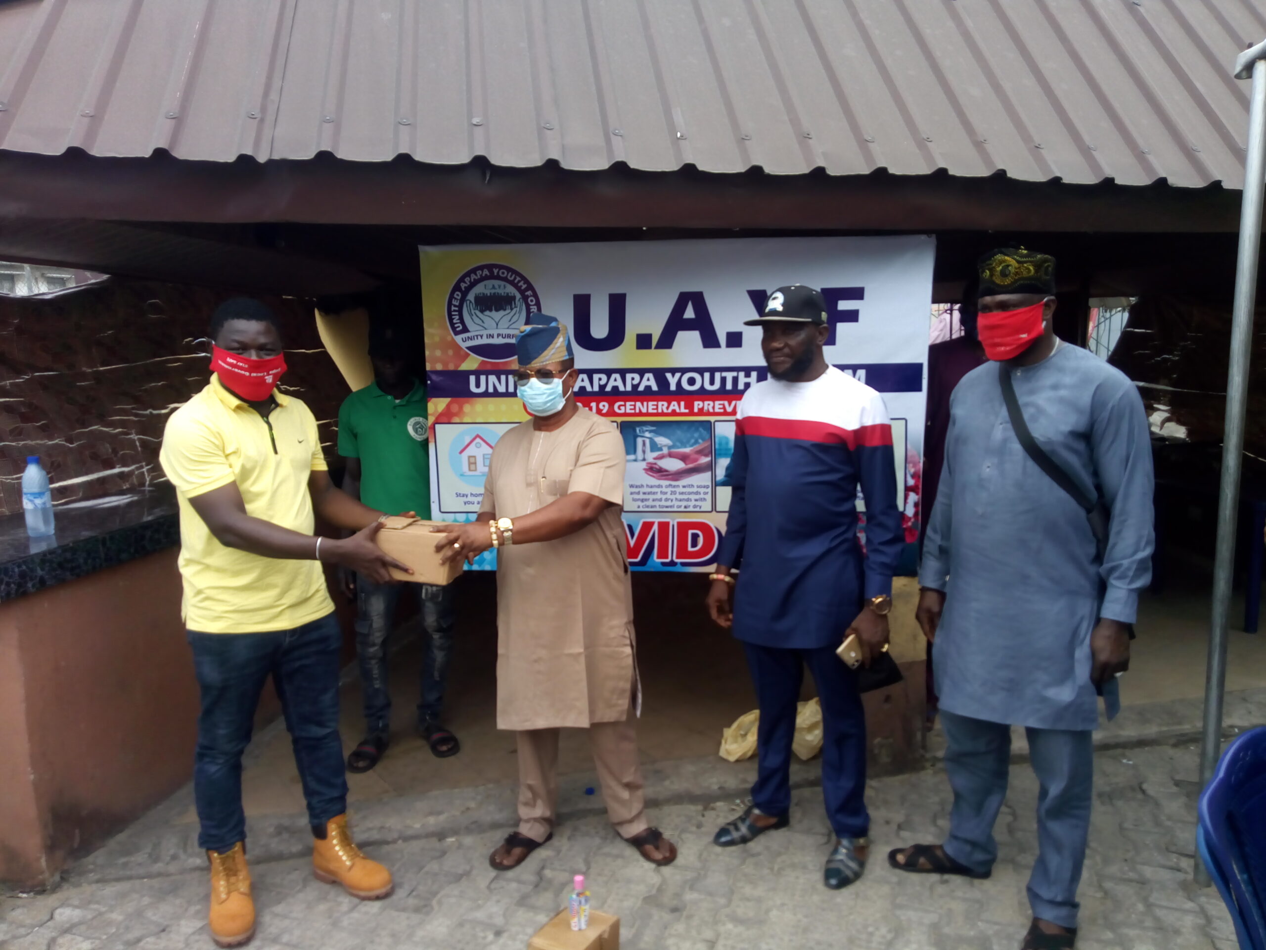 Receiving the cartons of sanitizers and facemasks from the youths on behalf of the community, the Baale of Apapa, Chief Hakeem Ogbara expressed joy on the step taken by the youths, that regardless of the fact that majority of them are unemployed, they have positioned themselves to join the government and the community to fight against this COVID 19.